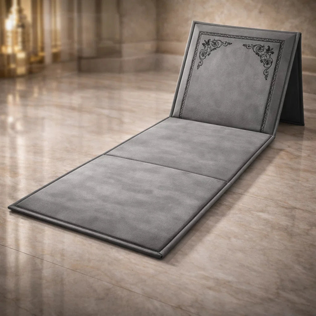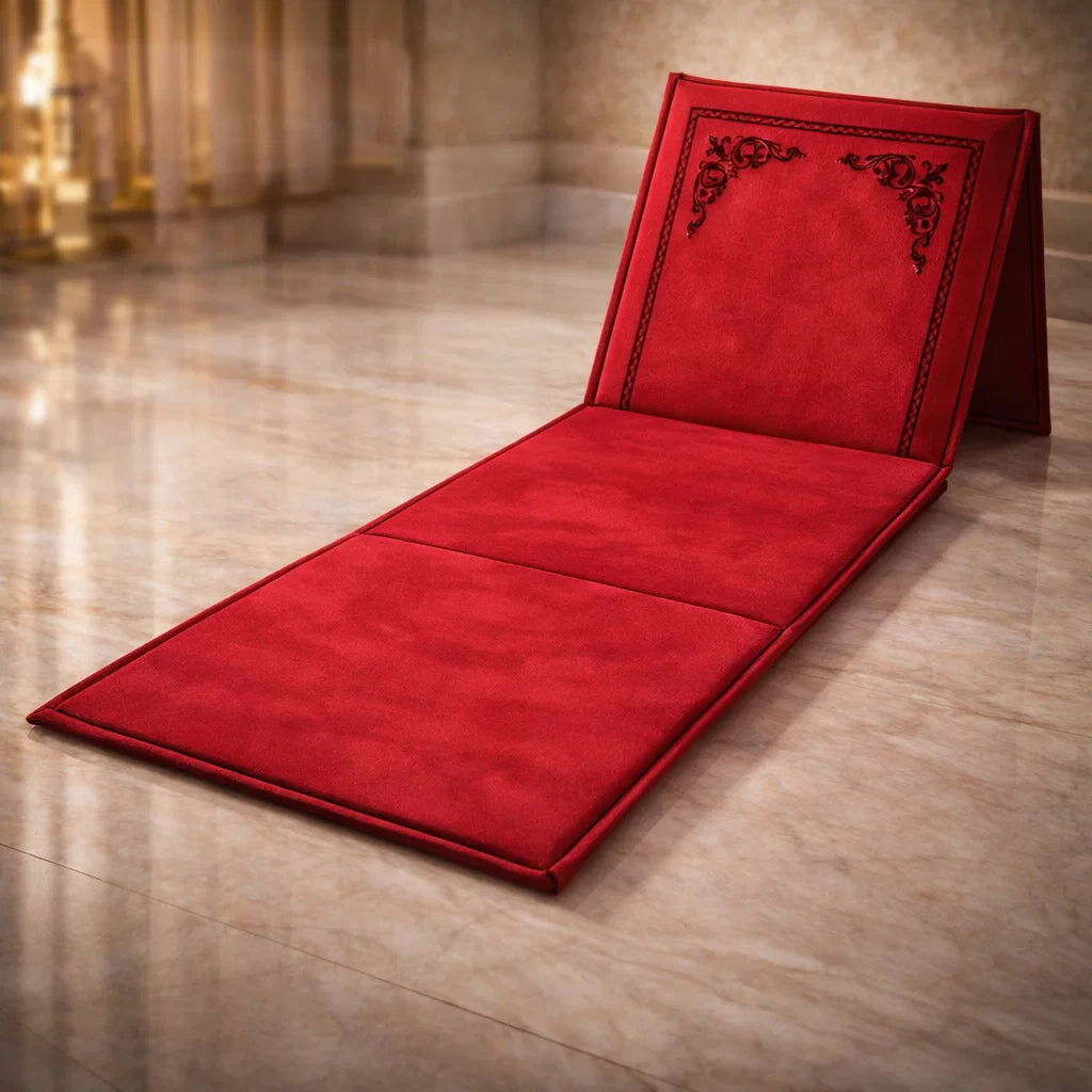 سجادة مخملية 2 في 1 — للصلاة براحة ودعم للظهر لكبار السن، قابلة للطي وسهلة الحمل.